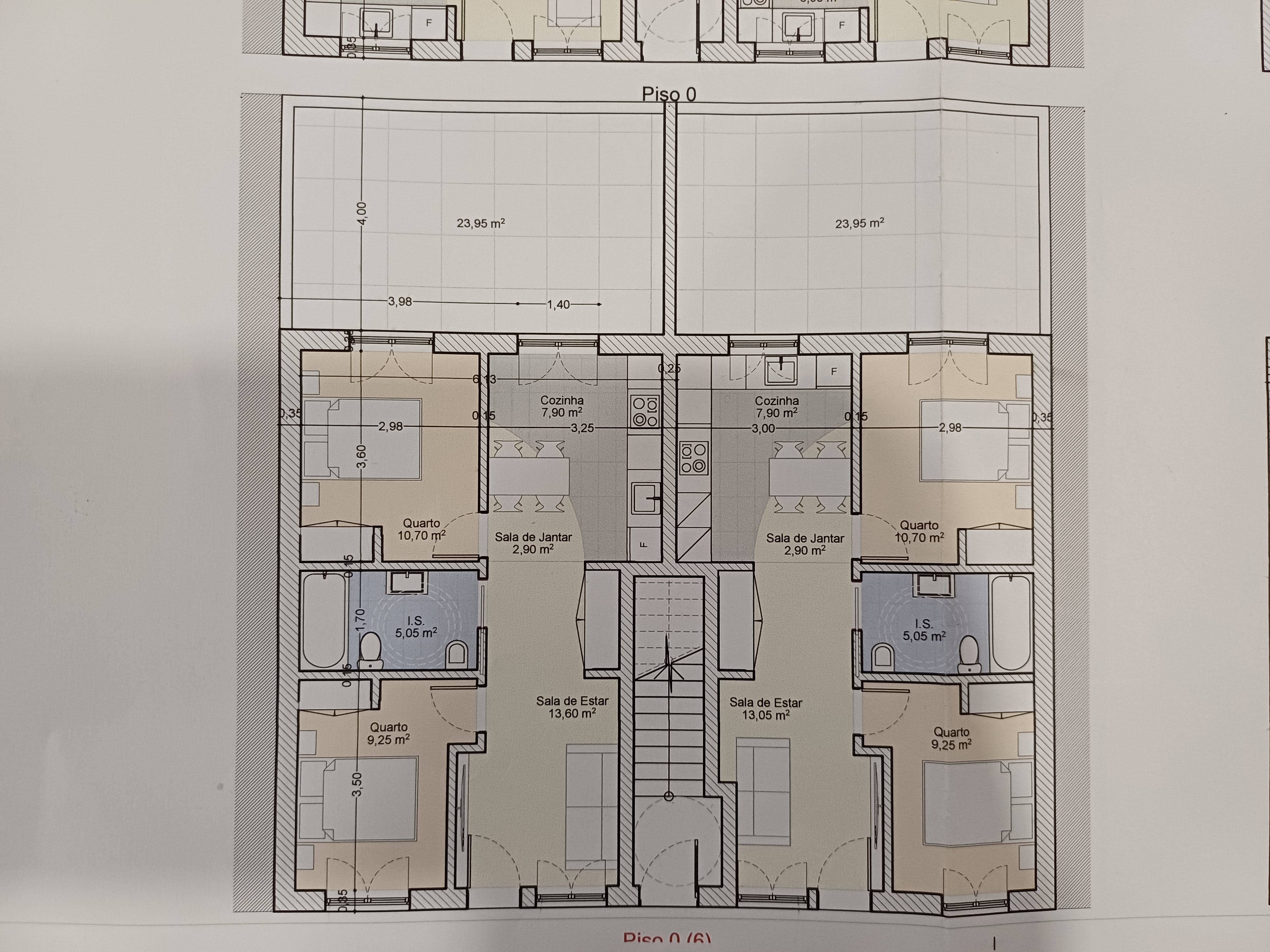 Distribuição Atual: Piso 0 com 2 frações T2, cada uma com lugradouro traseiro de 23.95m²; Piso 1 com 2 frações T1, ambas com varanda de 7m²; Piso 2 com 2 frações T2 em duplex, com varanda de 7m² cada.